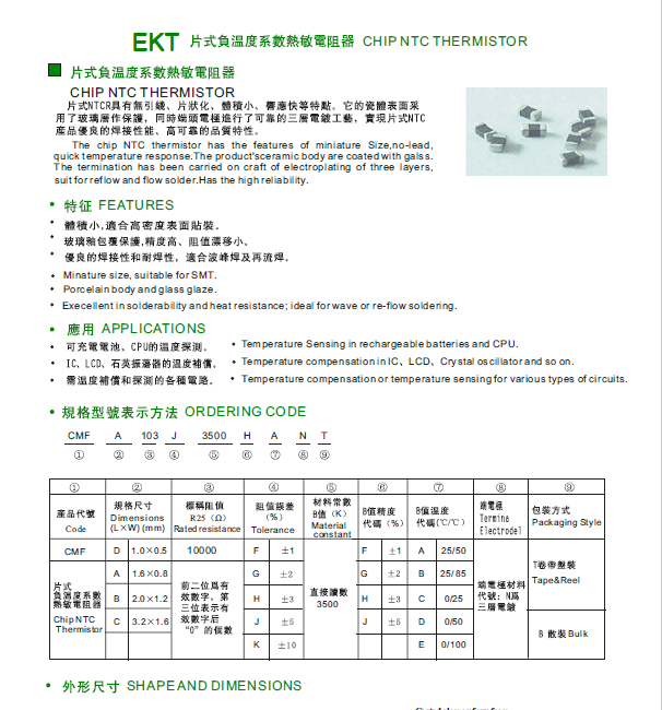 The corporation is devoted in products for overvoltage protection and overcurrent protection including SMD Thermistor Resistance and SMD piezoresistors. The full series of SMD thermistor resistance have a resistance value of 1K-1M and precision factors of 1%、3%、5% with a high reaction rate and good sensitivity. These products are applied to overheat consumption for home appliances, hot water meters, water heaters, refrigerators and lighting products. For products of more types, please download the corporation's product documents.