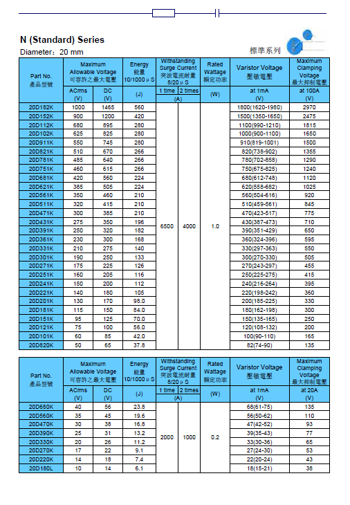 large-size 20mm, the product flow capability is 10KA and a surge capability is 20KV. More voltage:18V-1800V
