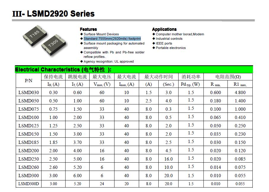 The latest product's current can reach 0.05A-7.5A, and voltage 6V-60V. The corporation has products in various sizes. The features of SMD product are that they have small sizes and small bonding pads, which can solve the problem of insufficient product space. With fast response, it can endure a working temperature of -40℃ to +85℃. As the temperature rises, it can protect the circuit by automatic break and healing by itself. It can prevent such situations that overcurrent damage other components. For more types, please download related documents.