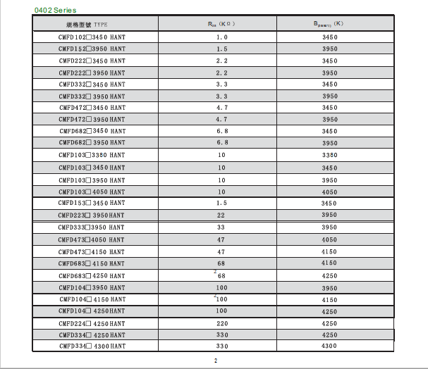 0402(1.0*0.5),The products' B values are 1K, 2.2K, 3.3K, 4.7K, 5.0K, 6.8K, 10K, 22K, 33K, 47K, 56K, 68K, 100K, 220K, 340K, 470K, 680K, 1M